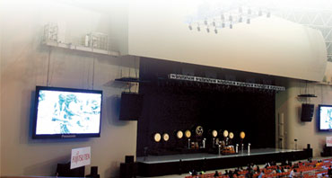 在舞台两侧的两个特大屏幕上播放富士通天的促销录像。