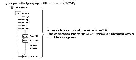 Somente os ficheiros com extensão MP3/WMA ".mp3" / ".wma" podem ser reconhecidos como MP3/WMA e reproduzidos. Acerte-se de guardar os ficheiros MP3 com a extensão ".mp3". Acerte-se de guardar os ficheiros WMA com a extensão ".wma". As letras "MP" da extensão serão reconhecidas quer introduzindo letras maiúsculas ou minúsculas.