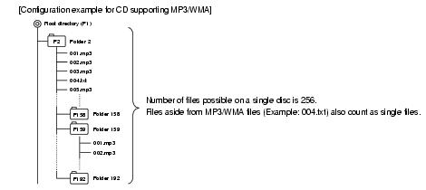 WMA (Windows MediaTM Audio) is format for audio compression technology. WMA files can be compressed to a size smaller than MP3 files. This main unit has limitations on the MP3/WMA file standards and recorded media and formats that can be used.
