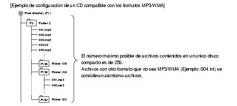 Sólo se pueden reconocer y reproducir como MP3/WMA los archivos cuya extensión sea ".mp3" o ".wma". Asegúrese de que guarde archivos MP3 que poseen la extensión ".mp3". Asegúrese de que guarda los archivos WMA con la extensión ".wma". Se reconocerán los caracteres "MP" de las extensiones de los archivos tanto en mayúsculas como en minúsculas.
